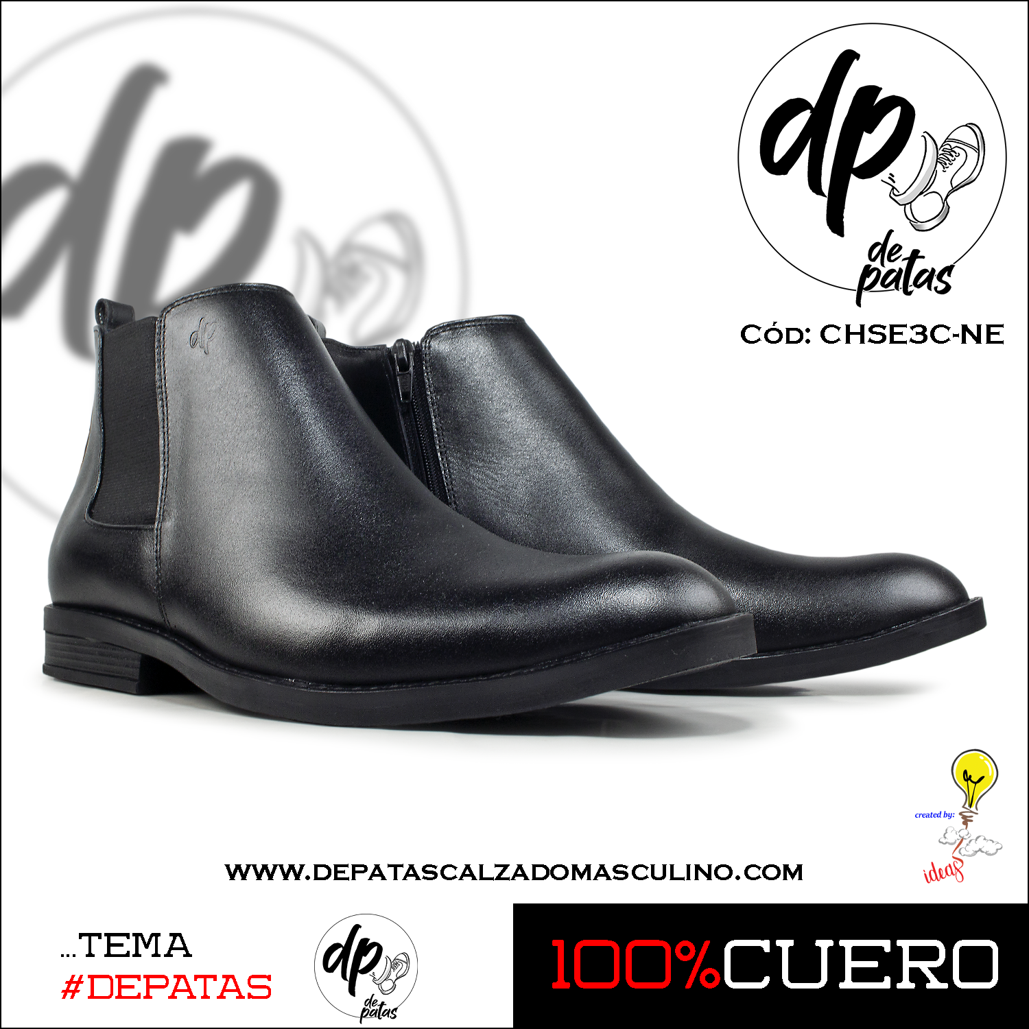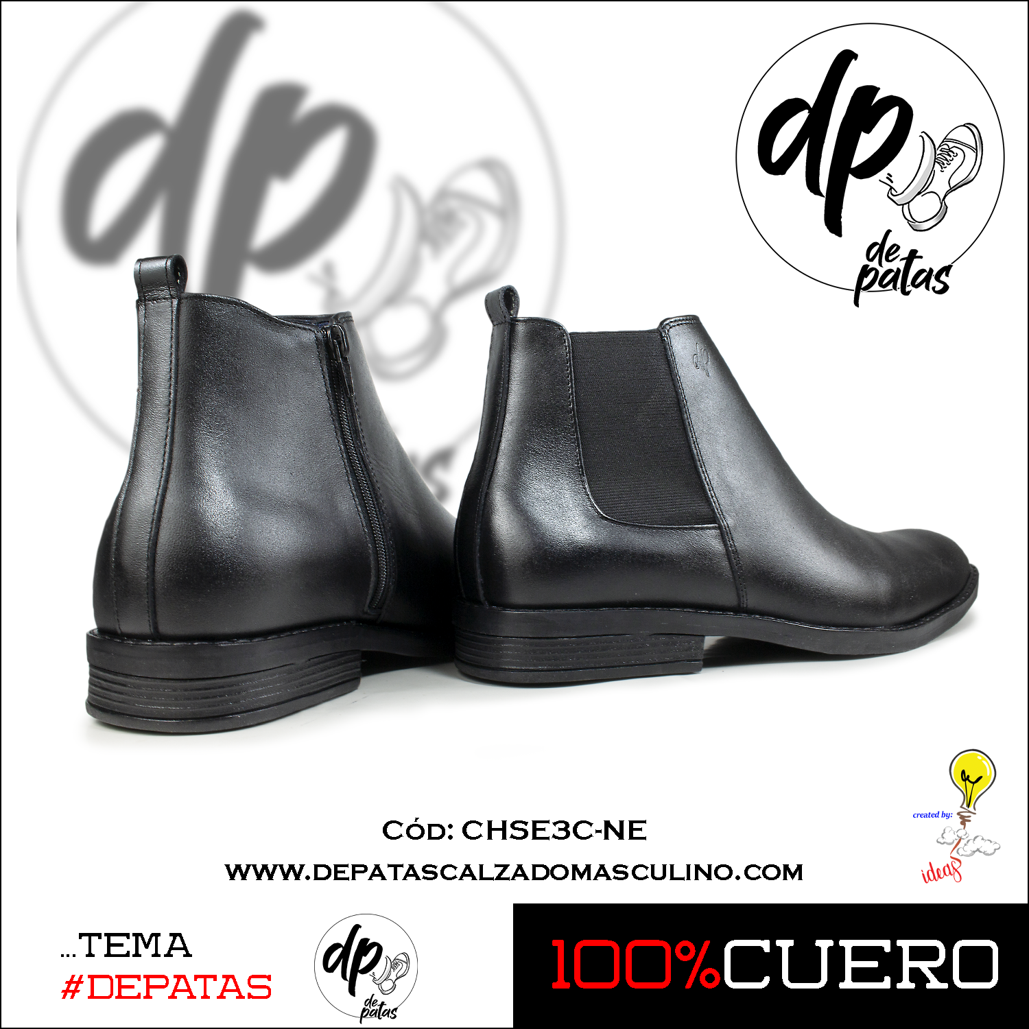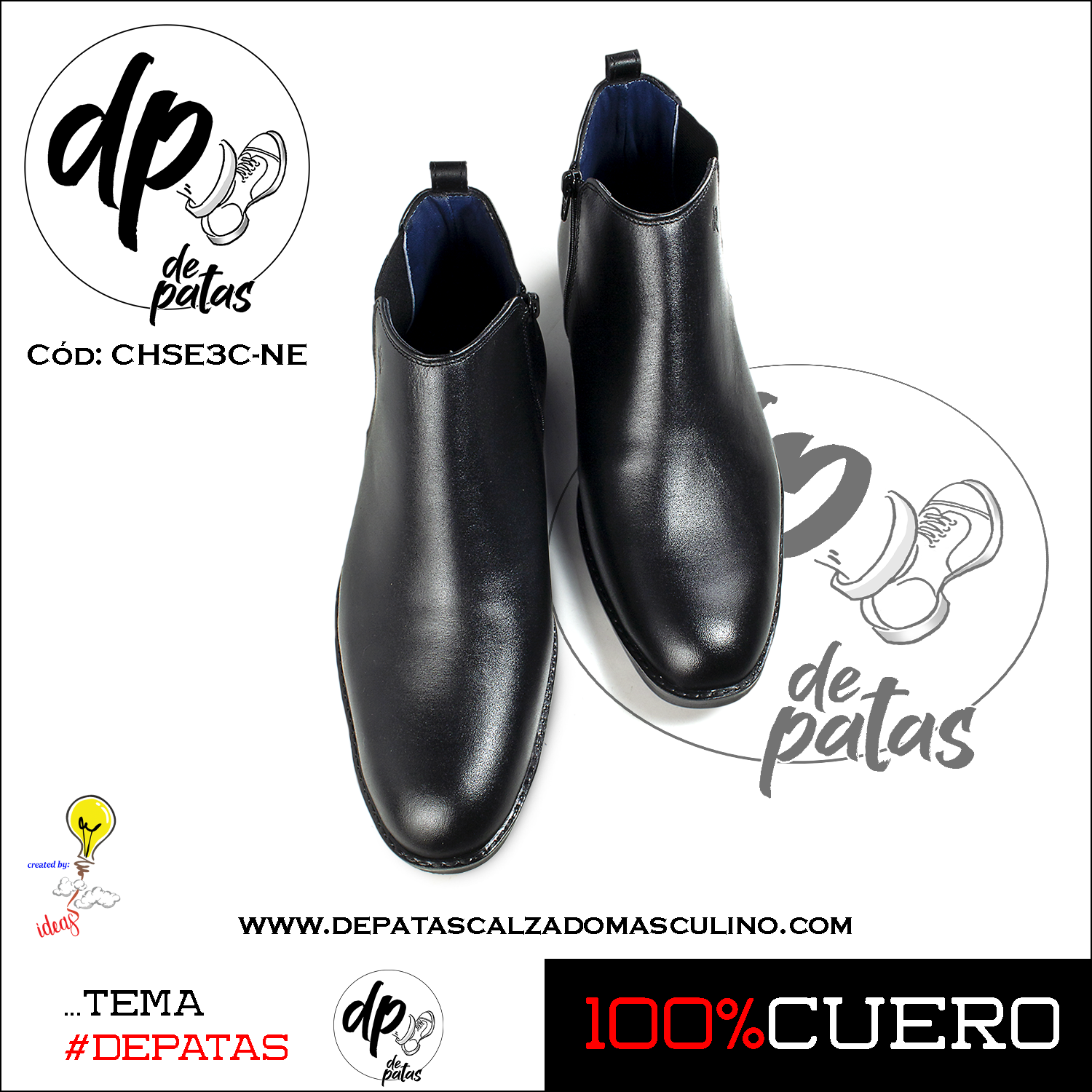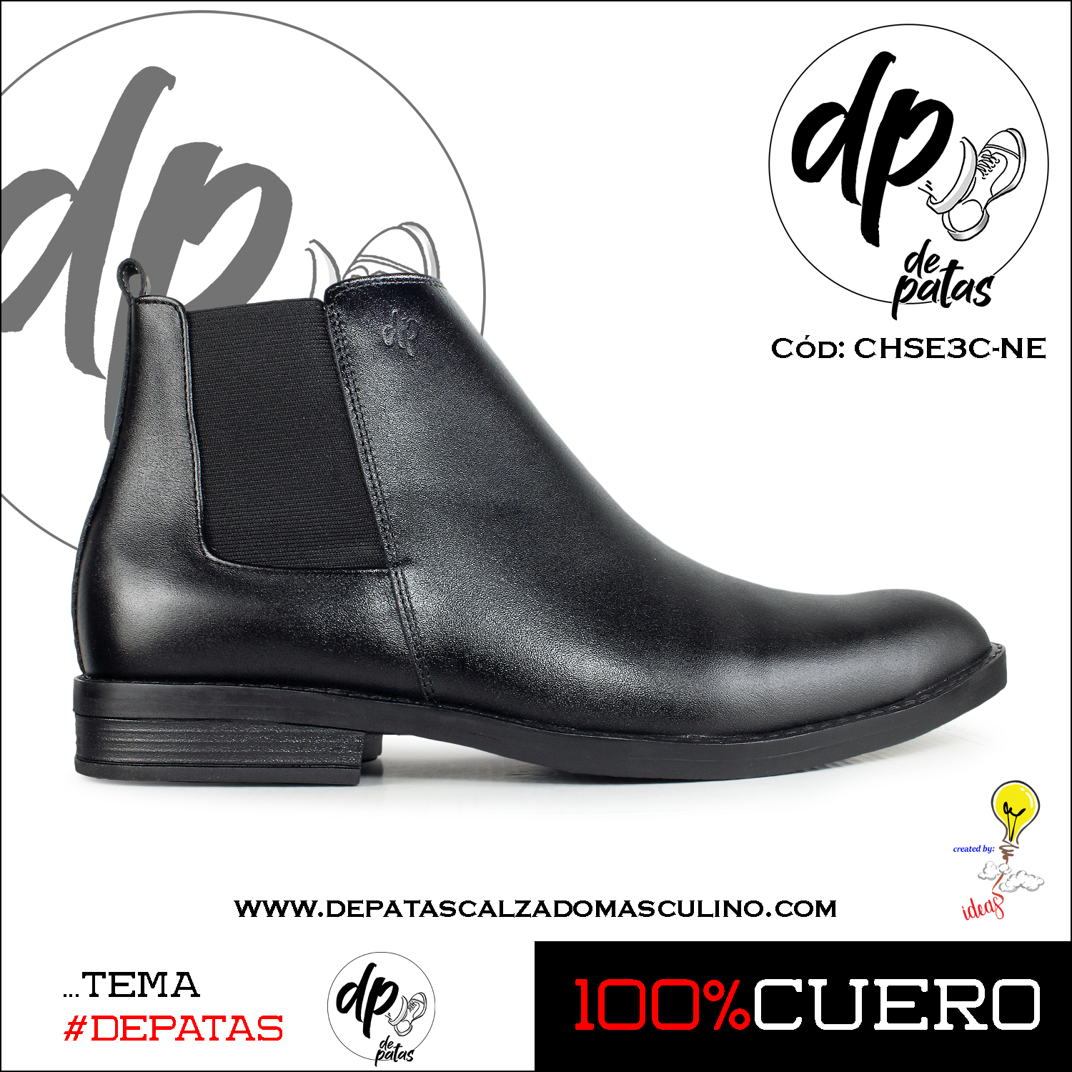 Descubre el botín Chelsea en negro, hecho con cuero lustrable. Su suela de caucho con taco partido ofrece comodidad y agarre, mientras que el forro y plantilla de badana mantienen tus pies frescos y suaves. Ideal para quienes buscan un calce amplio gracias a su horma grande.