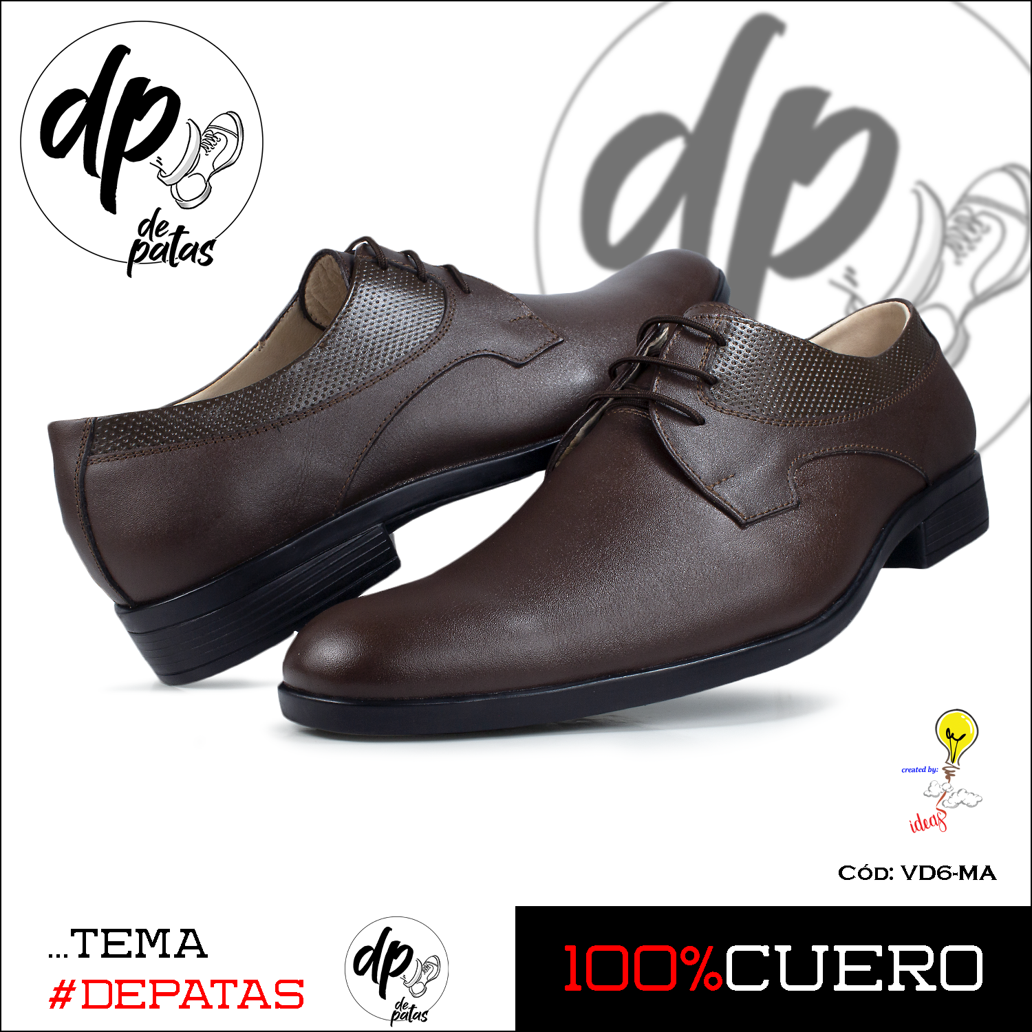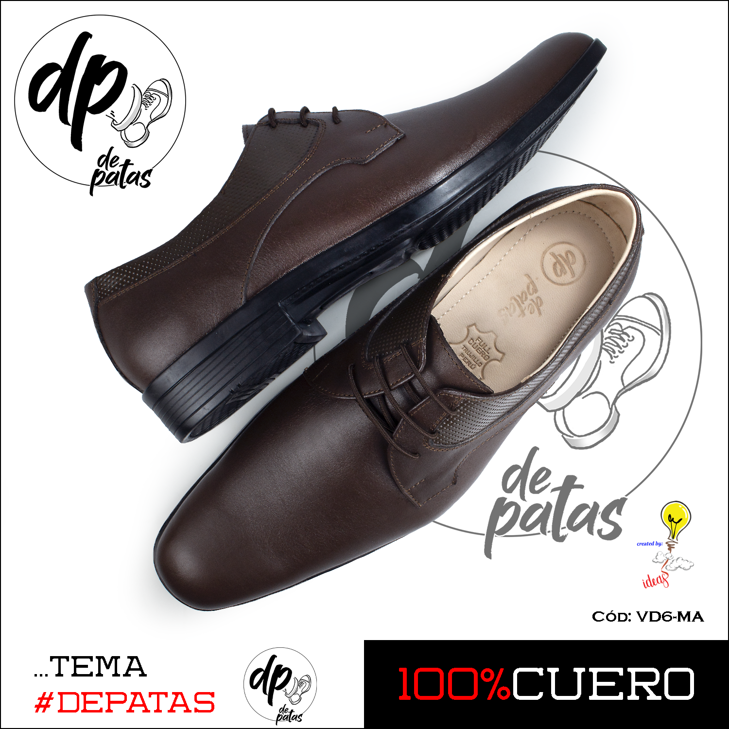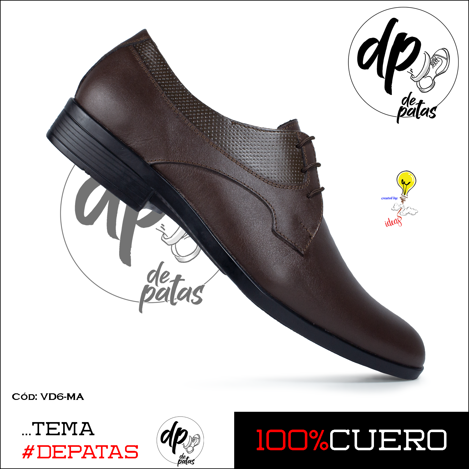 Derby (VD6-MA) es un zapato de vestir en color marrón, con capellada y plantilla de cuero lustrable, suela de caucho y forro y plantilla de badana. Comodidad y ajuste perfecto al pie. Fabricado con experticia en Trujillo, Perú.