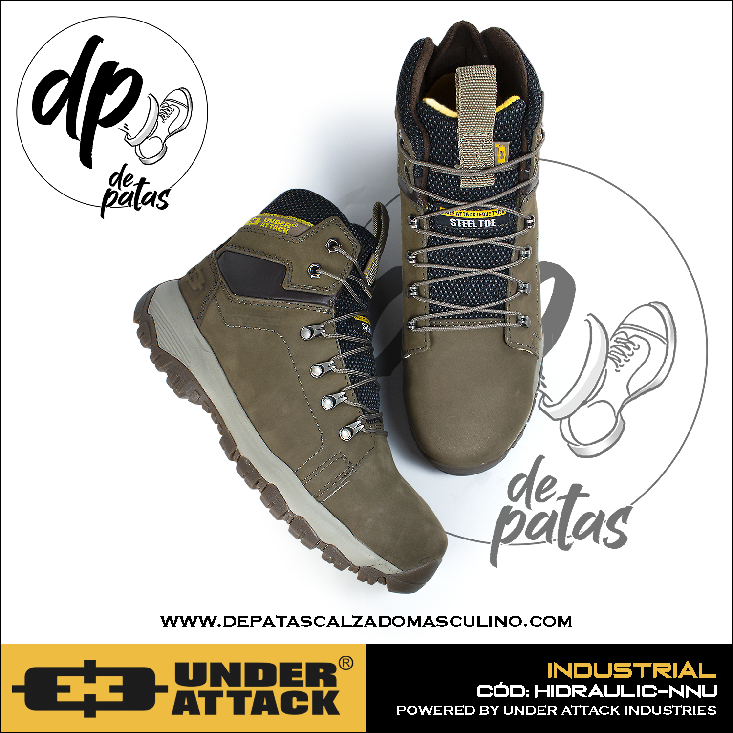 Botín industrial Under Attack con punta de acero reforzada, diseñado para proteger tus pies en entornos exigentes. Confeccionado en cuero natural con acabado nobuk en color nutria, ofrece durabilidad y resistencia. La suela de EVA con caucho corrido proporciona estabilidad y tracción en superficies variadas. Cuenta con forro textil transpirable y plantilla de poliuretano para mayor comodidad durante jornadas prolongadas.